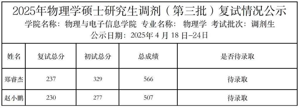 2025年物理学硕士研究生调剂(第三批)复试情况公示